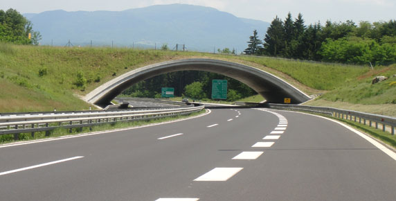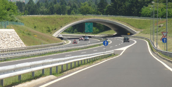The cut and cover structure is intended for the crossing of wild animals and the principal road over the motorway. The shallow arch-shaped cut and cover structure with a single span around 40 m was constructed due to favourable geological conditions and sufficient depth of the cuts. Portals are inclined so the total width of the structure is 40 m at the apex of arch and 60 m at the foundations. The structure consists of three longitudinal segments. The height of embankment is approximately 2.0m above the apex of the arch.
