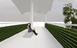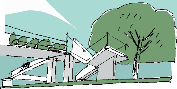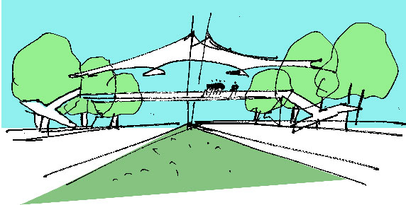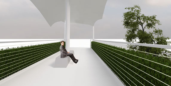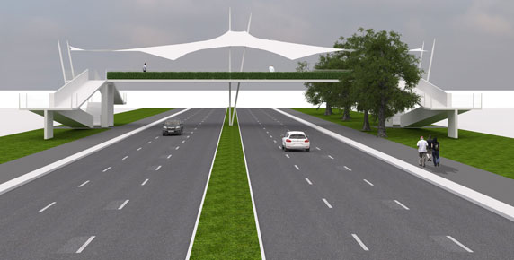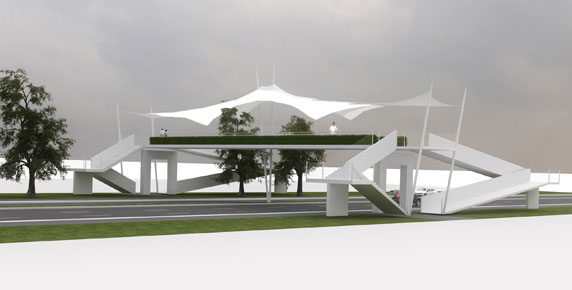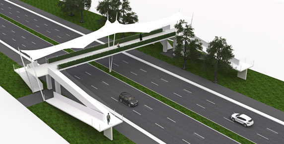 The other solution of pedestrian overpass, Bat-bridge, is designed as a wide steel girder bridging two spans around 20 m long. Access to the spanning superstructure is provided through access ramps and staircases positioned on both sides of the road. The roof of footbridge, shaped like Bat wings, made of plasticized canvass, is supported by two central pylons and the pylons located on the corners of superstructure. Box compartments for vegetation are integrated on both outer longitudinal sides of the superstructure.