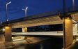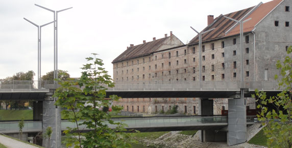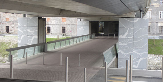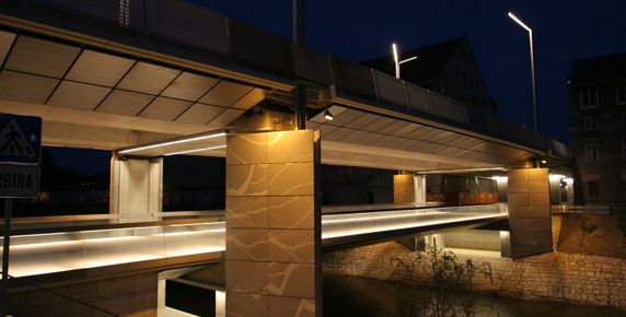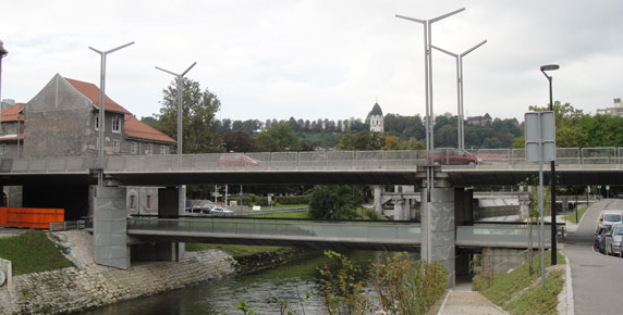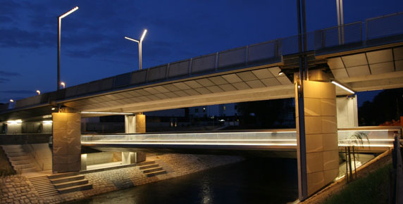 The Ljubljana inner city ring road was completed with construction of the two level Fabiani bridge. The lower integral superstructure, 50m in length and the span of 35m, is intended for connecting footpaths and bicycle lanes on the river banks of the Ljubljanica River. Vehicle traffic intended upper superstructure has 6 spans with lengths up to 35 m and with overall length of 150 m.