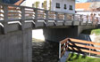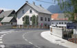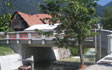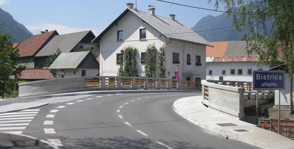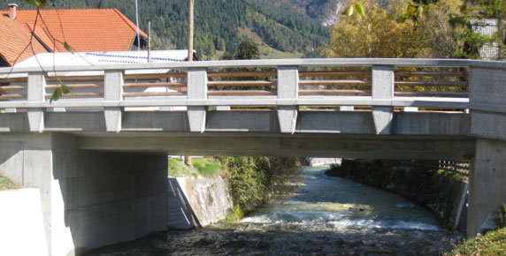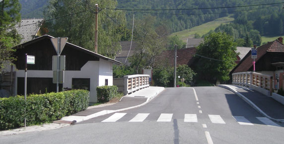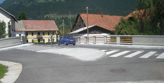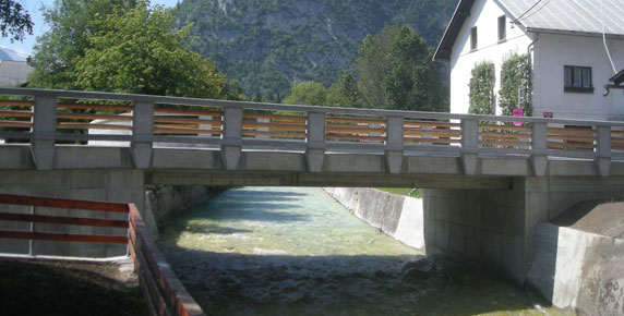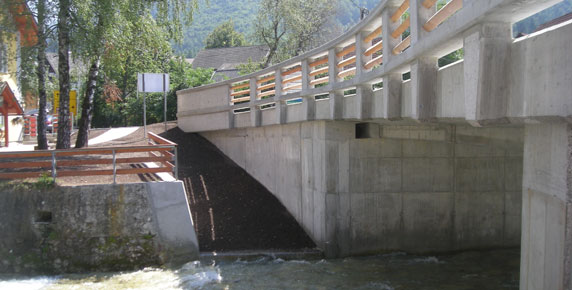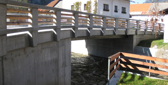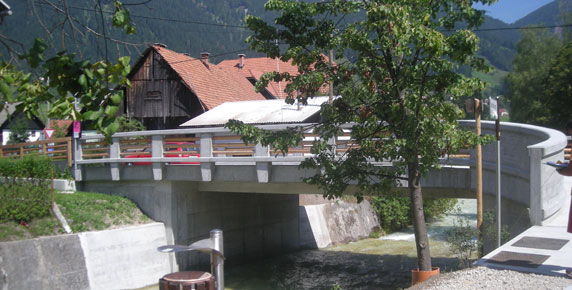 The mountain village of Mojstrana in the Gorenjska region is richer for a new bridge spanning the torrent stream Bistrica and some retaining walls along the banks. The 13 m long bridge boasts pedestrian walkways on both sides and replaces an older worn out and too narrow bridge that used to exist on the same location. The fences are made of columns with hand-tooled concrete surface and wooden battens giving the bridge a natural appearance and fitting in perfectly with the picturesque mountainous landscape.
