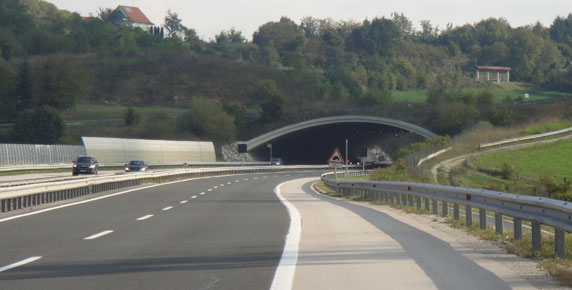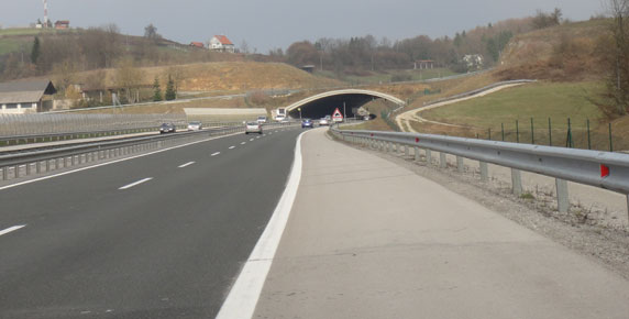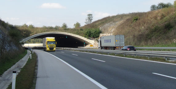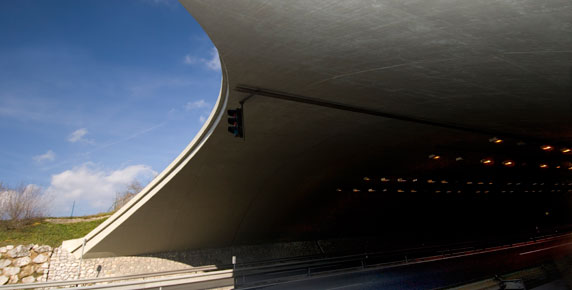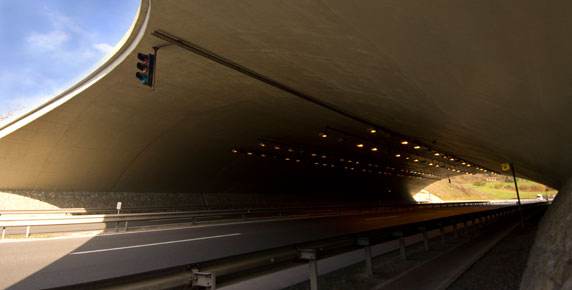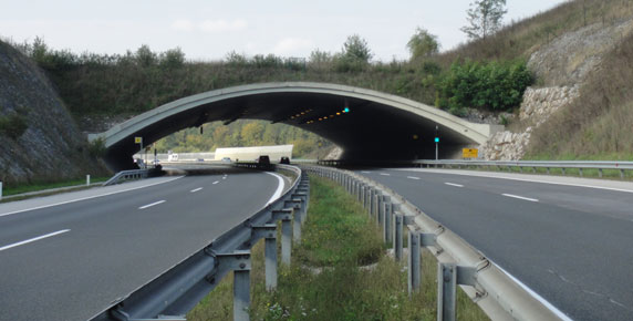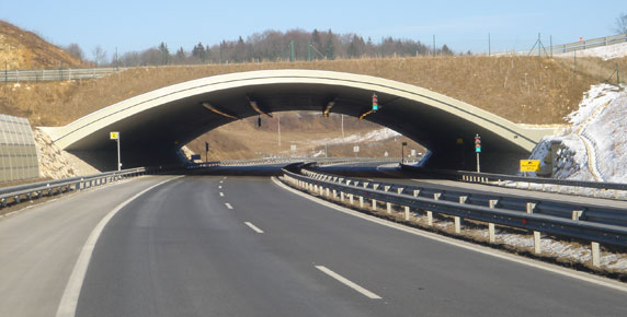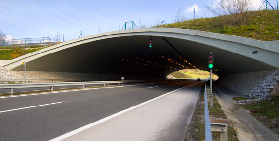 The cut and cover structure on the Medvedjek slope is intended for the crossing of two roads (with cross-roads) over the motorway. The length of the shallow arch shaped single span is 37m, the structure portals are inclined so the total width of the structure is 86 m at the apex of the arch and 100 m at the foundations. The structure consists of nine longitudinal segments. The height of embankment ranges between 1.0m and 3.0m above the apex of the arch.