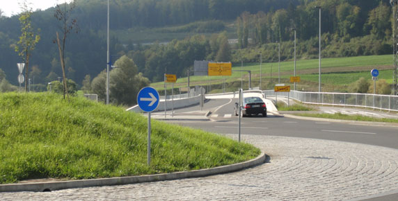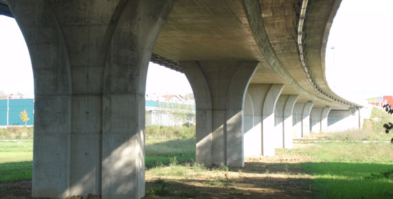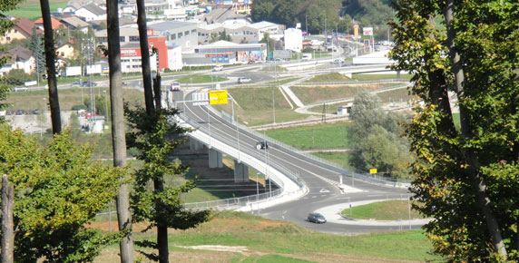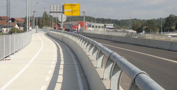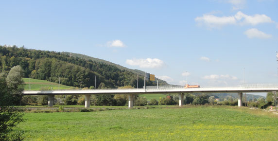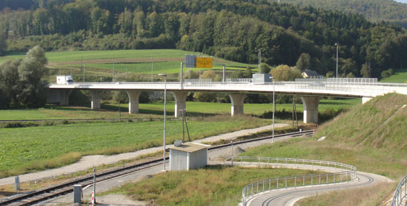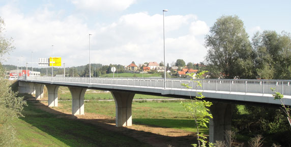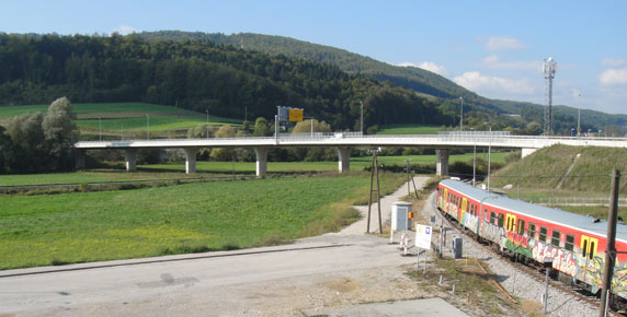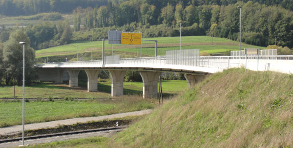 The Trebnje viaduct, which connects the primary road with the town of Trebnje, spans the Temenica river and two railway tracks. The sleek, semi-integral structure, with the total length of 180 m, is continuous over seven spans with a prestressed RC slab of superstructure. Similarly as in the next, the Trebnje overpass, the middle supports have an interesting funnel shape.